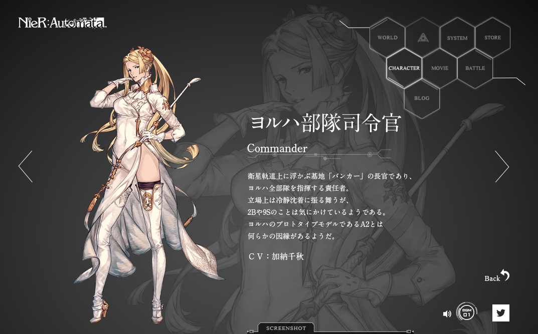 ニーアオートマタで出て来たのはオペレーターさん(女性)司令官(女性)2B A2 9Sここまでがヨルハ